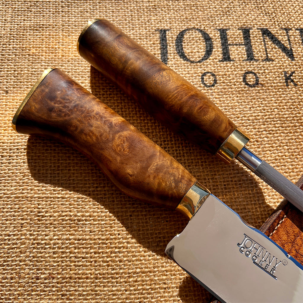 Os cabos em madeira natural de alta densidade, com acabamento em latão polido, são modelados artesanalmente, proporcionando ergonomia perfeita, equilíbrio e exclusividade em cada peça. O conjunto acompanha uma exclusiva bainha em couro natural, reforçando o caráter tradicional e sofisticado do projeto.