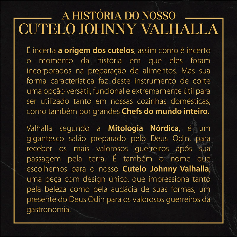 O Cutelo Johnny Valhalla possui uma ergonomia perfeita, fabricados com lâminas integrais oferecem robustez e segurança para cortes pesados de todo tipo de alimentos. Ao mesmo tempo, seu design exótico e extremamente funcional, traz em sua lâmina a geometria ideal para ser utilizado na preparação de legumes, vegetais e carnes em geral, dando a este acessório a versatilidade que somente um Cutelo Johnny Valhalla consegue oferecer.