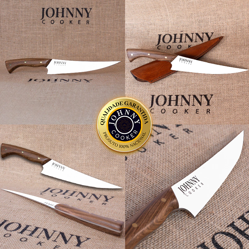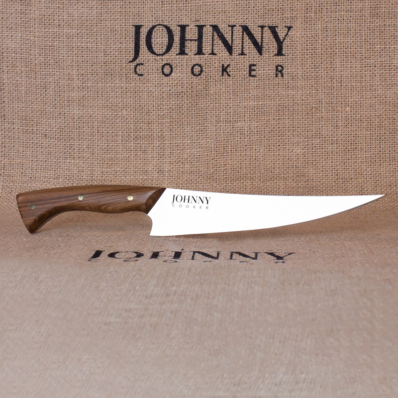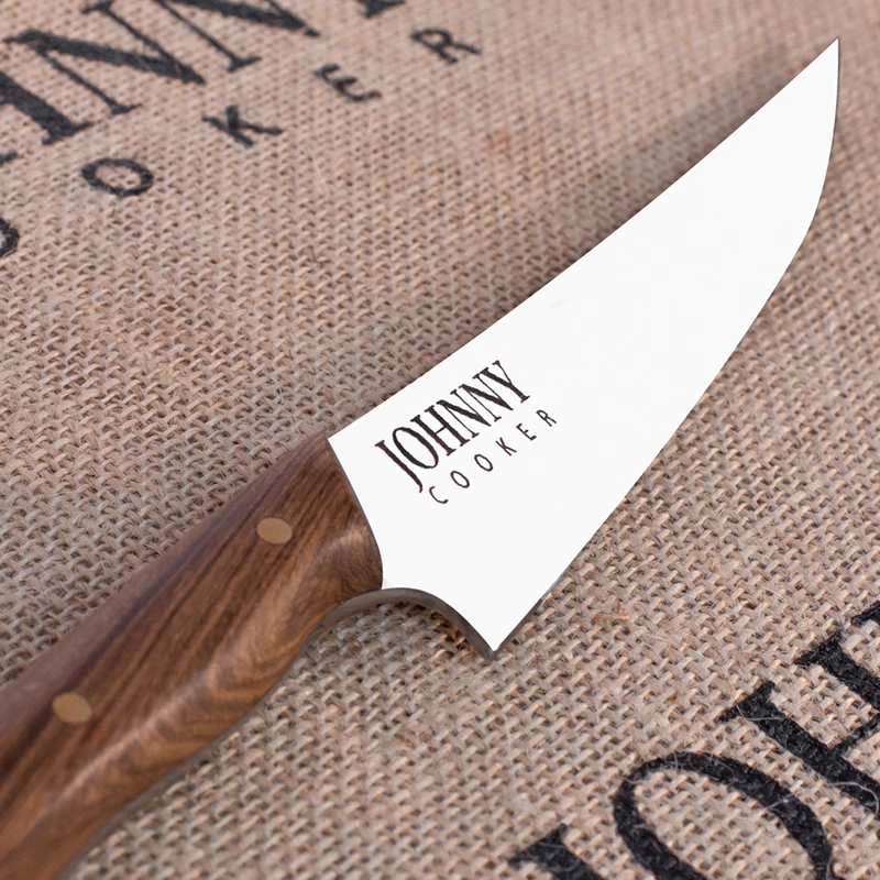 O design minimalista, elegante e extremamente funcional, lâmina em aço inox com 3mm de espessura cabos em madeira nobre e perfil esguio com ponta ultrafina, fazem desse modelo a faca perfeita para corte finos e precisos, graças a robustez e ao perfeito equilíbrio de suas formas, características marcantes nas facas de lâminas integrais Johnny Cooker.