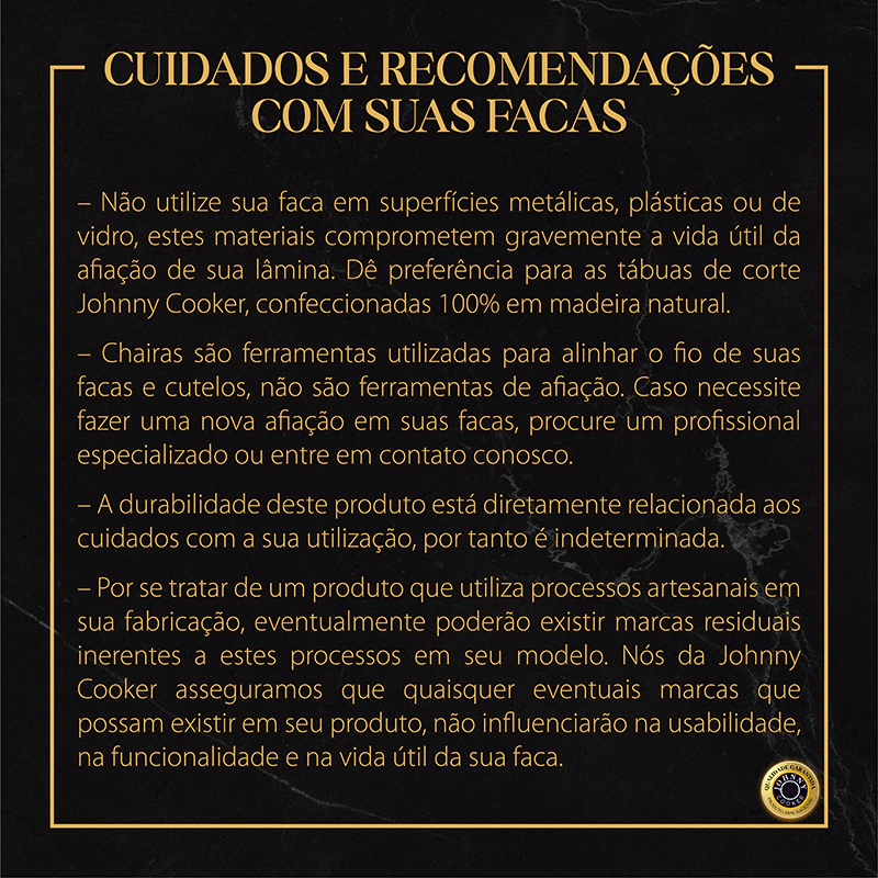 * As medidas são consideradas de referência, pois podem apresentar pequenas variações em função das operações artesanais de produção. * Por serem produzidas em madeiras naturais, os cabos das Facas Johnny Cooker podem apresentar variação na coloração quando comparados com as imagens de divulgação.