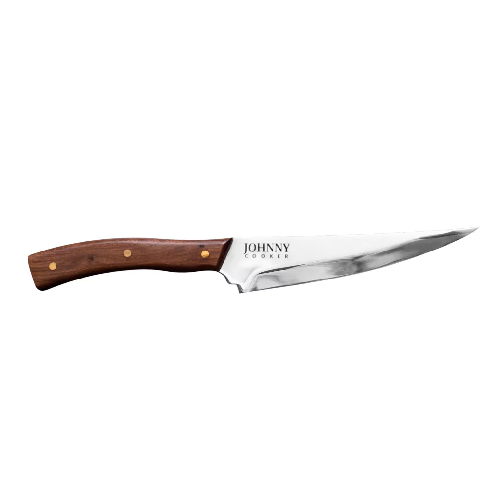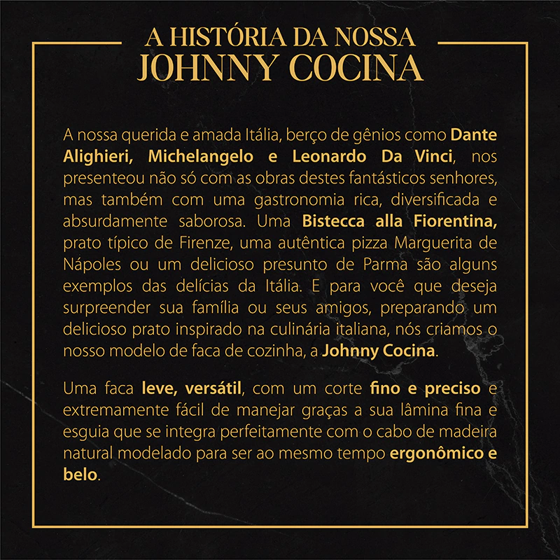 A faca aço Johnny Cocina foi projetada para oferecer um toque de beleza, sofisticação e simplicidade a sua cozinha, uma faca leve e versátil, produzida com aço inox cirúrgico e madeiras naturais de alta densidade.