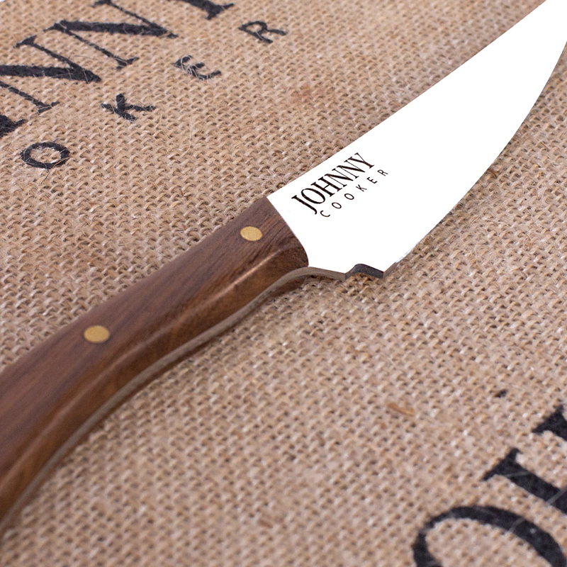 Os cabos das facas Johnny Cocina, com seu design exclusivo são sempre produzidos com madeiras naturais de alta densidade, fixados às lâminas com resinas especiais e com os nossos já tradicionais rebites em latão polido, proporcionando longa durabilidade e fácil limpeza.