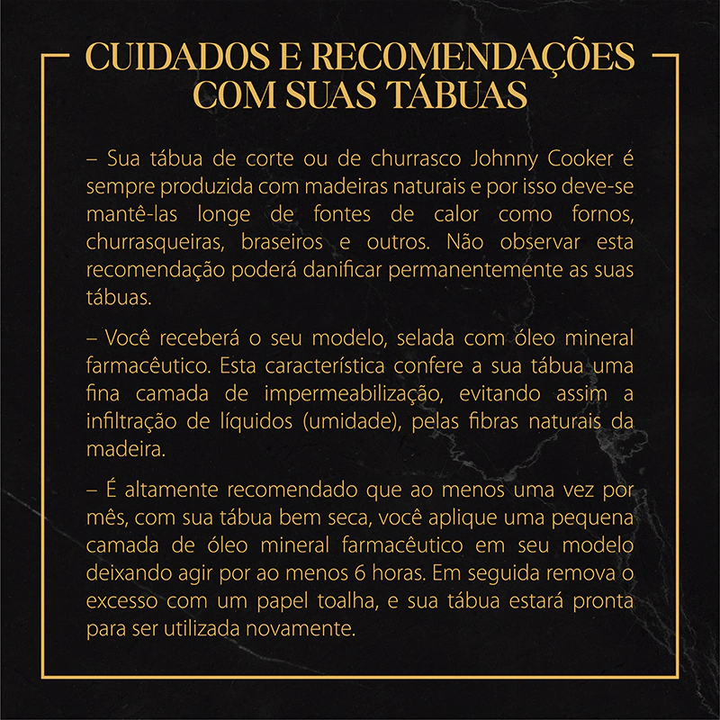 * As medidas são consideradas de referência, pois podem apresentar pequenas variações em função da disponibilidade das matérias primas. As medidas consideradas são sempre as maiores, não levando em consideração recortes e arredondamentos. * Por serem produzidas em madeiras naturais, as tábuas de corte Johnny Cooker podem apresentar variação na coloração e nos desenhos naturais da madeira, quando comparadas com as imagens de divulgação.